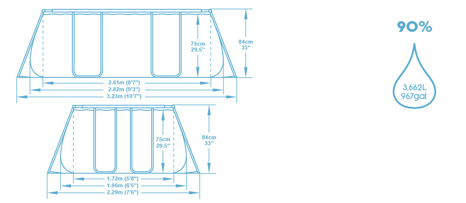 Bazeni Power Steel™ Rectangular so pravokotni del ponudbe priljubljene serije bazenov Bestway® Power Steel™. Prav tako kot okrogle različice, so tudi pravokotni modeli prijetne nevpadljive svetlo sive barve, ki paše v urbana in bolj zelena okolja. Modra mozaična poslikava v notranjosti montažnega bazena poskrbi za dobro počutje uporabnikov. Bazensko platno (ali tako imenovani »liner«) in kovinsko ogrodje bazena odlikuje visoka stopnja kakovosti in vzdržljivosti. Železen okvir bazena je zaščiten pred rjavenjem s sistemom plastičnih zaponk, ki preprečujejo vlagi, da bi preodrla v notranjost konstrukcije in tako dokazano zagotavljajo 75% nižjo možnost za nastajanje korozije.